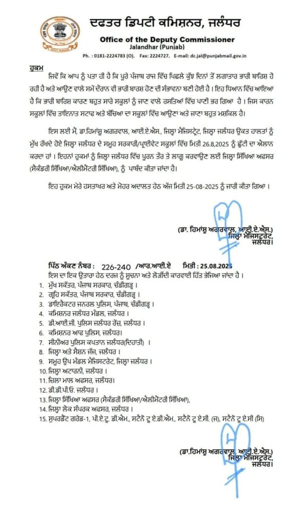 ਮੇਰਾ ਆਪਣਾ ਪੰਜਾਬ, ਜਲੰਧਰ (ਬਿਉਰੋ): ਜਿਵੇਂ ਕਿ ਆਪ ਨੂੰ ਪਤਾ ਹੈ, ਕੁੱਝ ਦਿਨਾਂ ਤੋਂ ਸੂਬੇ ਚ ਭਾਰੀ ਬਾਰਿਸ਼ ਹੋ ਰਹੀ ਹੈ ਅਤੇ ਆਉਣ ਵਾਲੇ ਸਮੇਂ ਚ ਵੀ ਭਾਰੀ ਮੀਂਹ ਦੀ ਸੰਭਾਵਨਾ ਬਣੀ ਹੋਈ ਹੈ ਅਤੇ ਸੜਕਾਂ ਤੇ ਪਾਣੀ ਭਰ ਗਿਆ ਹੈ, ਜਿਸ ਕਰਕੇ ਸਕੂਲ ਵਿਚ ਤਾਇਨਾਤ ਸਟਾਫ਼ ਅਤੇ ਵਿਦਿਆਰਥੀਆਂ ਨੂੰ ਸਕੂਲ ਜਾਣ ਚ ਮੁਸ਼ਕਿਲ ਦਾ ਸਾਮਣਾ ਕਰਨਾ ਪੈ ਰਿਹਾ ਹੈ। ਇਸ ਨੂੰ ਧਿਆਨ ਚ ਲਿਆਉਂਦੇ ਜਲੰਧਰ ਜ਼ਿਲ੍ਹੇ ਦੇ ਡੀ ਸੀ ਡਾ. ਹਿਮਾਂਸ਼ੂ ਅਗਰਵਾਲ ਵਲੋਂ 26-08-2025 ਦਿਨ ਮੰਗਲਵਾਰ ਨੂੰ ਜ਼ਿਲ੍ਹੇ ਦੇ ਸਰਕਾਰੀ ਅਤੇ ਗ਼ੈਰ ਸਰਕਾਰੀ ਸਕੂਲਾਂ ਚ ਛੁੱਟੀ ਦਾ ਐਲਾਨ ਕੀਤਾ ਹੈ ਅਤੇ ਇਸ ਨੂੰ ਪੂਰਨ ਤੌਰ ਤੇ ਲਾਗੂ ਕਰਵਾਉਣ ਲਈ ਜ਼ਿਲ੍ਹੇ ਦੇ ਸਿੱਖਿਆ ਅਫ਼ਸਰ ਨੂੰ ਪਾਬੰਦ ਕੀਤਾ ਹੈ।
